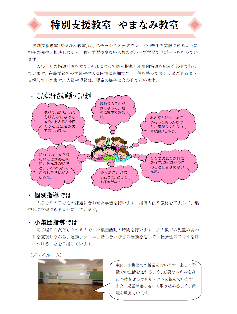 ○やまなみ教室の紹介(福生市特別支援教室) ⇒特別支援教室のリーフレットが開きます。 本校は平成28年度までの通級指導学級のノウハウを生かしながら、 平成29年度から福生市で新たに開設した特別支援教室の拠点校として、 子どもたちの特別支援教育に取り組んでいます。 ・【参考資料】こちらは福生市の発達障害のリーフレットです。